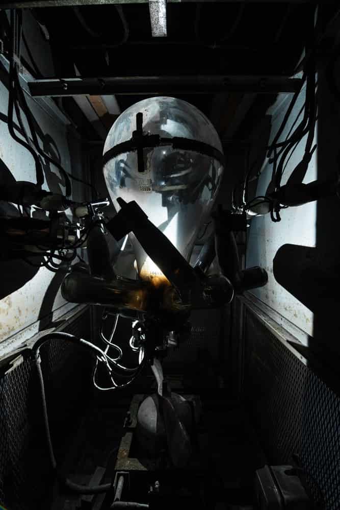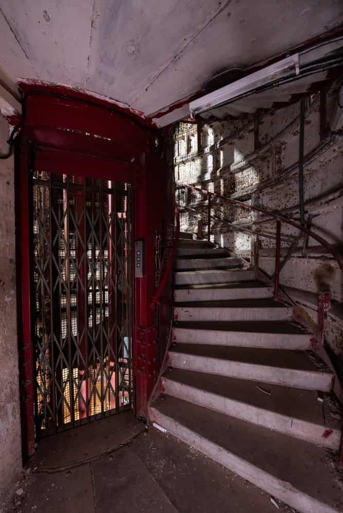 Inside the northern turret the original entrances have been bricked up with two steps leading to a sliding metal grille and then a brick wall with a small window in the top. There is a sink at the bottom of the steps. The circular turret has the lift shaft running down the centre, which also acts as the ventilation intake shaft through the raised brick blockhouse with ventilation louvres on the roof. A circular corridor runs around the top of the lift shaft with two stairways winding down around it, one leading to the upper landing and the other to the lower landing 140 feet below. The stairs to the lower landing are out of use and accessed through a trap door on the floor. The lift is in working order though rarely used. At the bottom of the lift shaft on the upper landing there was no lighting, as the wiring in this part of the tunnels is considered unsafe. Turning right leads first to the extract fan and then into the switchgear room.
