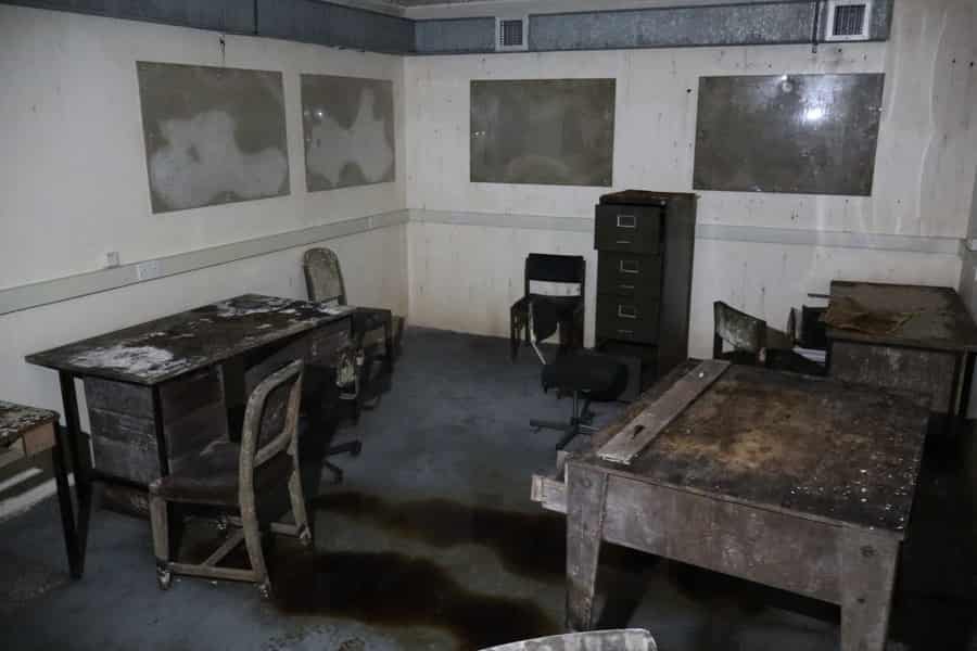 This was to be an emergency control room in the event of an attack, all the phone lines from the normal above ground control room where duplicated into the bunker, along with the radio communications at the time, and as you see from the photos there were bunks and basic facilities. Our department was responsible for running up the Standby Generator once a month so we got in there frequently. I think the damp has got the better of the site now so expect it will decline with age, however it is on a secure site so will not get vandalised. (Ian Coates)