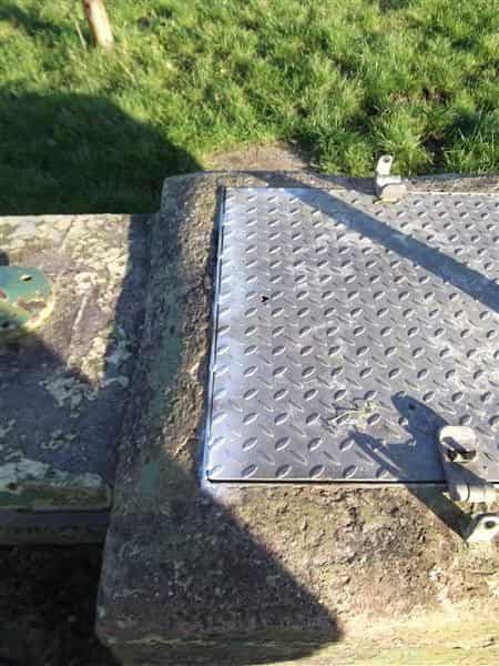 WELDED All surface features remain intact but the post is set very low in the ground and what appears to be the BPI pipe is offset from its usual position and is located 3 feet to one side of the ventilation shaft. The green paint is flaking. The hatch is locked with the words ‘Danger - keep out’ painted on it. In recent years this post has been broken into on a number of occasions and the owner has had to replace the padlocks at his own expense. Following continued vandalism the hatch has now been welded shut.