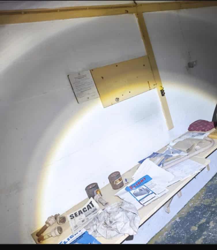OPEN All surface features remain intact and in good condition with some green paint and all the ventilation louvres still in place. The original locking bar is across the hatch but it is not locked. The internal doors at the bottom of the shaft are locked. The table, shelf, cupboard and twin bunks remain in place.