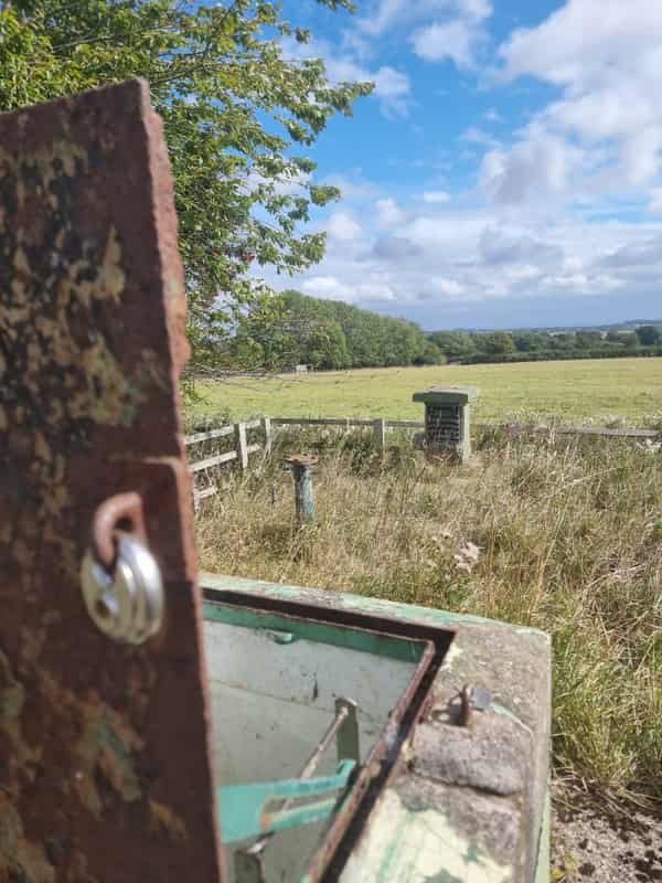 OPEN All surface features remain intact but there is damage to both ventilation shafts and soil erosion of the mound has revealed the brickwork below the access shaft. There is some flaking of the dark green paint. A metal dome on the ventilation shaft indicates this was a master post. The post was locked when visited in 1999, the padlocks have now been cut off and the post is open. Externally the following items remain, twin bunks with matresses, table, shelf, cupboard, battery box, 3 chairs, BPI mount, mirror, some papers, light, BT junction boxes and wiring.
