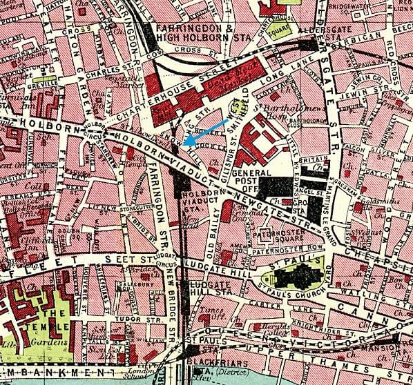 Snow Hill station was opened by the London Chatham & Dover Railway on 1 August 1874 on the existing City Line between Ludgate Hill and Farringdon Street. It was renamed Holborn Viaduct Low Level 1.5.1912. The main entrance was on the north side of the viaduct consisting of a four storey building with a single storey above viaduct level. The booking hall was at basement level sandwiched between the road level and the trains below. A separate entrance was provided on Snow Hill from where a footpath led up to the east side of the station building. A covered way and a flight of steps linked the Low Level and High Level Stations.