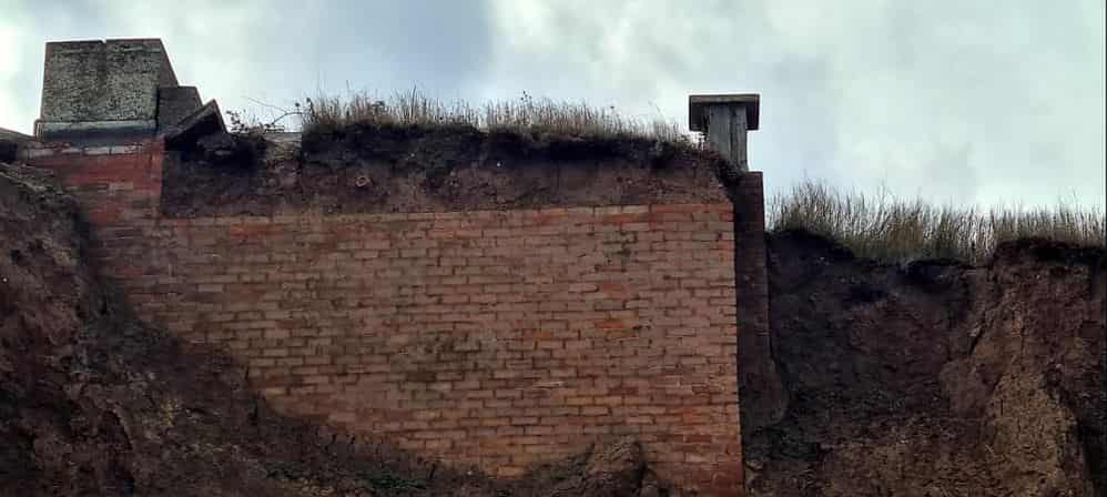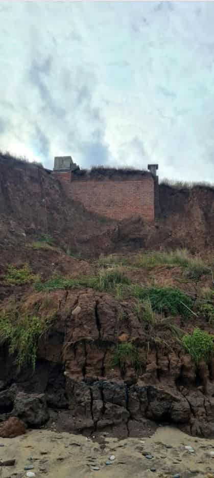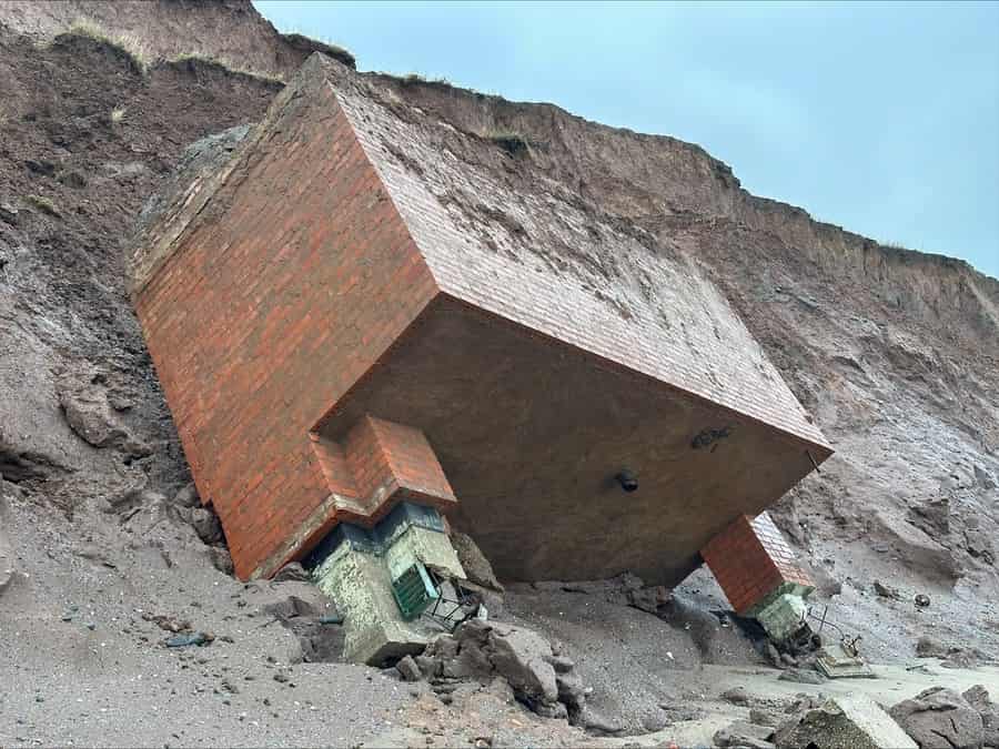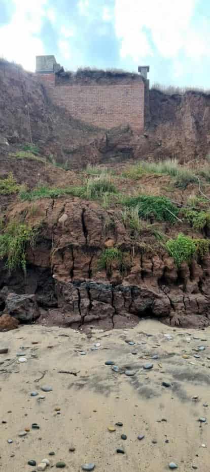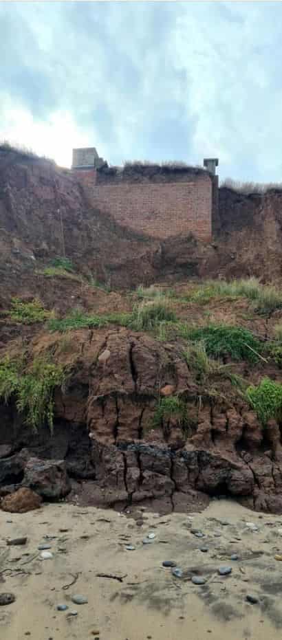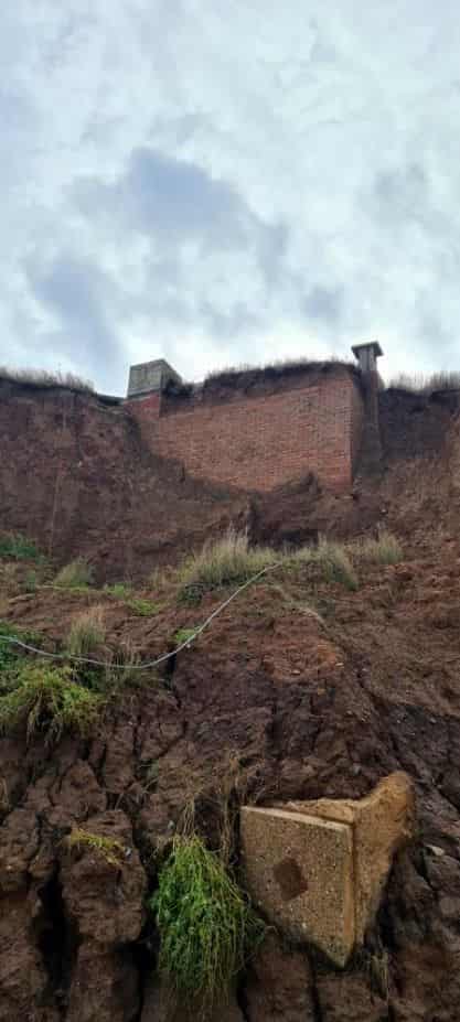 An Orlit stands on top of a six sided lozenge shaped pillbox with a blast wall protecting the entrance on the west side. An iron ladder gives access to the roof of the pillbox and entrance to the Orlit which is in good condition. The South West corner of the Orlit has been removed and replaced with a brick pillar with a plinth on top. There is a GZI mounting on top of the plinth with brick steps at the corner of the Orlit giving access to this plinth. The Orlit has also been damaged by vandals with the internal wall and crew room roof panel lying in the grass.