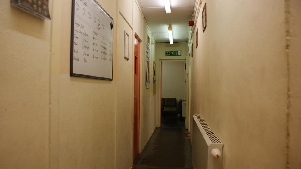 On the left hand side of the spine corridor the original male and female toilets are still intact and in use although the showers have been taken out of use and boarded over. There is one room accessed from the end of the corridor, this has a secondary entrance into the building.